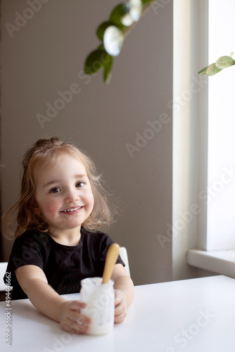 Funny little girl with dirty face eating plain homemade yogurt from glass jar using spoon. Vertical. 18-24 months kid girl in black t-shirt eating yogurt and looking window. Vertical format