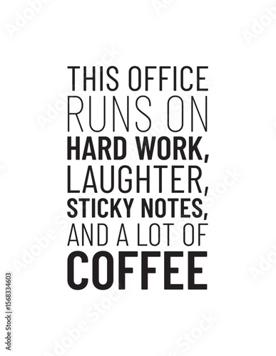 Funny Office Quote – Bold black and white quote perfect for office decor: “This office runs on hard work, laughter, sticky notes, and a lot of coffee.” Funny and relatable