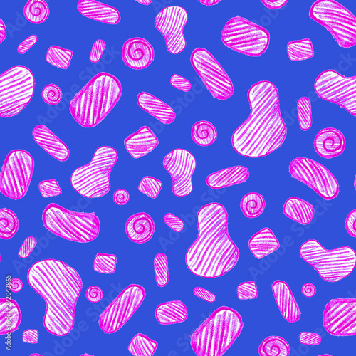 Funny pencil elements. Pink circles, ovals and beans on a lilac background. Hatching with pencils. Funny microbes