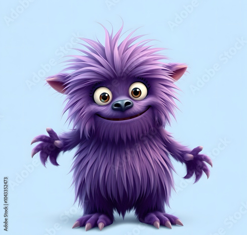 Funny purple fluffy monster on a clean blue background. Joyful and soft little monster. Charming yeti. Halloween character.