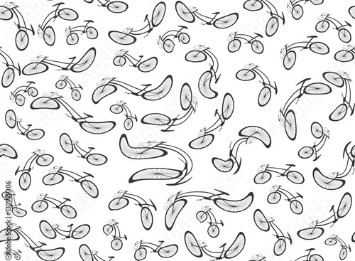 Funny vector seamless pattern with stretched and misshapen mountain bikes