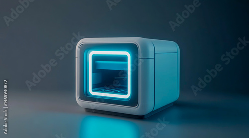 Futuristic 3d render of a cubical appliance featuring blue glowing neon light