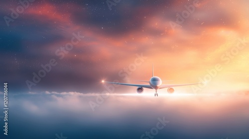 Futuristic aircraft in metallic silver flying under a vibrant sunset sky above clouds digital art serene environment aerial perspective dreamlike vision