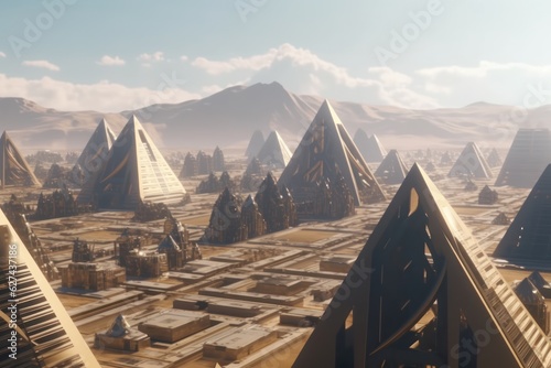 Futuristic ancient egyptian city with huge pyramids and high tech spaceships flying around background generative ai
