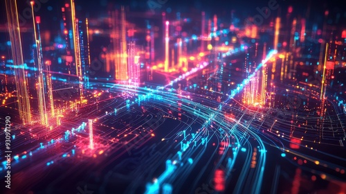 Futuristic chart depicting data flows in a smart city, with bright, neon-colored streams of information connecting buildings, vehicles, and infrastructure in a complex, interconnected web