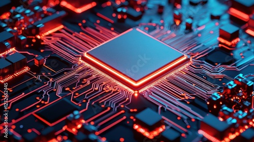 Futuristic Circuit Board with Neon Lights and Digital Connections