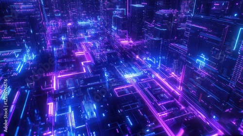 Futuristic city with neon lights and glowing circuits.