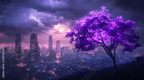 Futuristic cityscape at night, illuminated skyscrapers, glowing purple tree, stormy sky, digital art, cyberpunk aesthetic. Neon Noir Aesthetics. Illustration