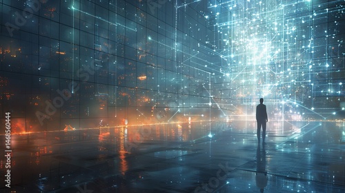 Futuristic cityscape interior, a solitary figure contemplates interconnected network