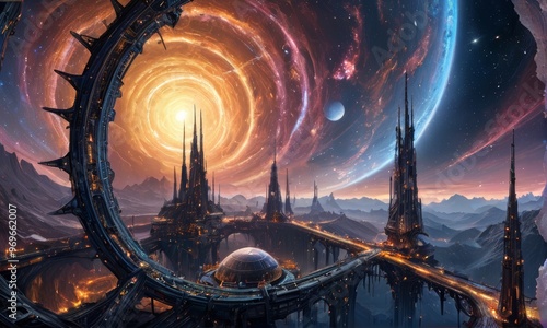 Futuristic Cityscape on Alien World with Cosmic Vortex
