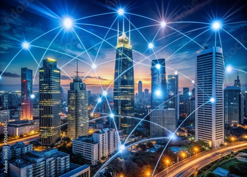 Futuristic cityscape with sleek skyscrapers and bustling streets, illuminated by a network of glowing connections, representing the synergistic blend of 5G and IoT technology.