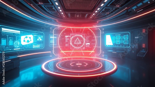 Futuristic control room with vibrant screens.