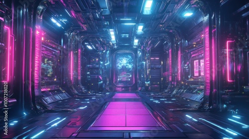 Futuristic corridor with glowing pink and blue neon lights.