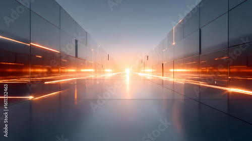 Futuristic corridor with reflective surfaces and glowing lights, leading towards a bright horizon, creating a sense of depth and perspective in a modern environment. Selective focus
