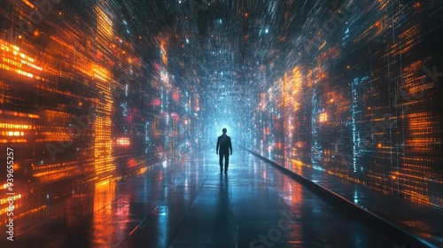 Futuristic Cyber Pathway with Illuminated Digital Grid and Person Silhouette