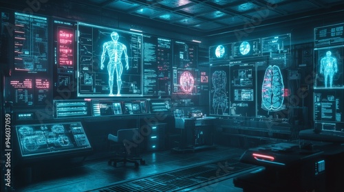 Futuristic Cybernetic Human Body Analysis in Neon Lit Lab