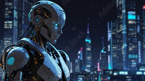 Futuristic Cyborg Overlooking a Neon Cityscape