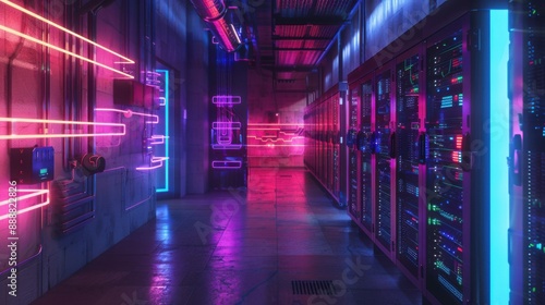 Futuristic data center with vibrant neon lights, showcasing advanced technology and modern server racks in a sci-fi inspired environment.