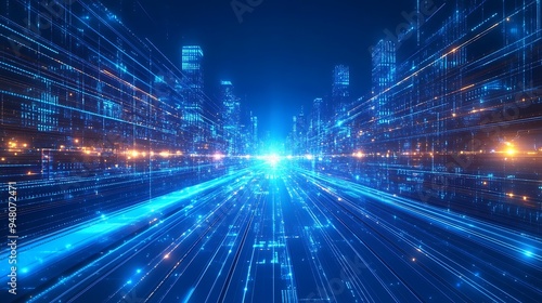 Futuristic digital city with glowing lights and data streams representing technology, communication, and digital infrastructure.