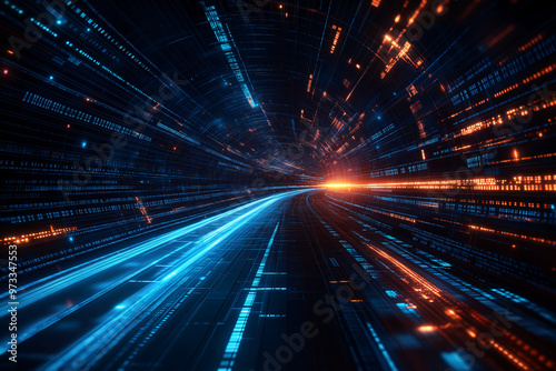 Futuristic digital data stream with blue and orange light trails, representing fast technology and data transfer