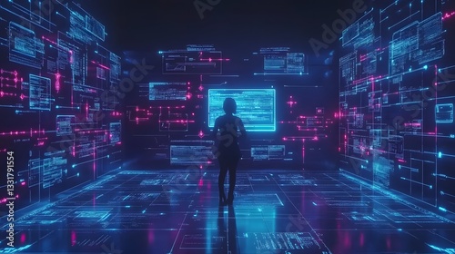 Futuristic digital environment with a person exploring holographic data in a high-tech space