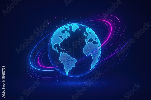 Futuristic digital globe Earth with glowing orbit lines and cosmic background.