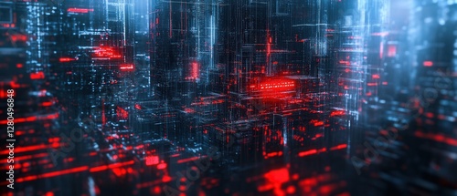 Futuristic Digital Landscape with Neon Lights in Red and Blue Tones