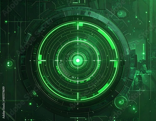 Futuristic digital radar, showcasing a green-lit targeting system within a complex, mechanical framework. Intricate details create a sci-fi feel