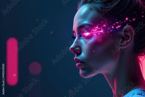 Futuristic female figure with cybernetic eye panel on forehead , digital, interface, technology