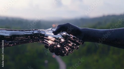 Futuristic Handshake Chrome Robot Carbon Fiber Hand Technology Partnership