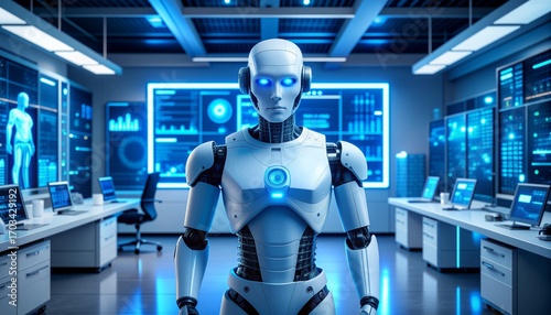 Futuristic humanoid robot in control room with glowing cyber panels
