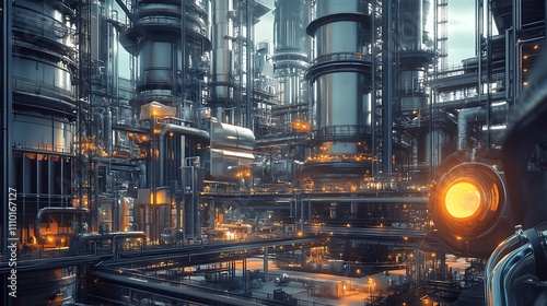 Futuristic industrial complex with towering structures, intricate pipework, and glowing lights.