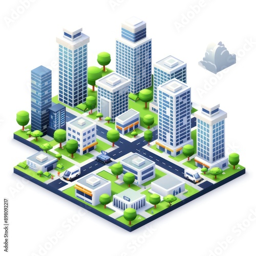 Futuristic Isometric Urban Landscape with High-Rise Buildings and Cars on White Background - Vector Illustration, Generative Ai