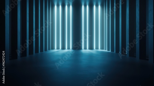 Futuristic Neon Lit Corridor with Blue LED Lights in a Dark Modern Interior Space