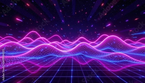 Futuristic Neon Waveforms with Digital Data Elements