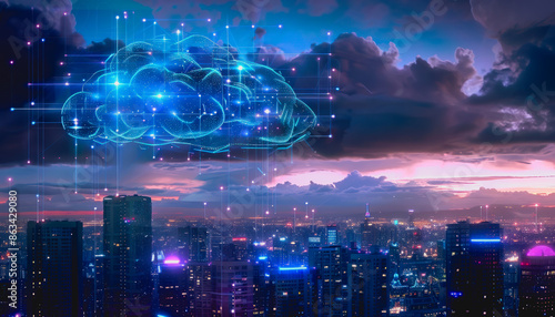 Futuristic night cityscape with glowing digital cloud, network lines, and neon blue highlights.
