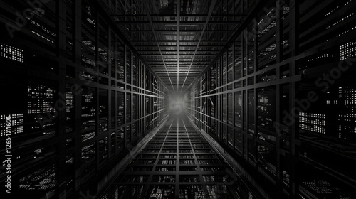 Futuristic Perspective of a Dark Fractal Tunnel with Light Source