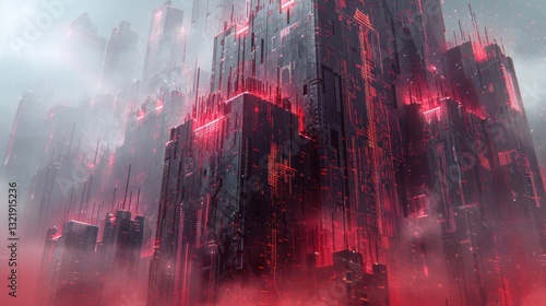 Futuristic Red Neon Cityscape with Abstract Skyscrapers and Fog