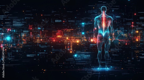 Futuristic Representation of the Human Body with Data Visualization and Digital Elements in a High-Tech Environment