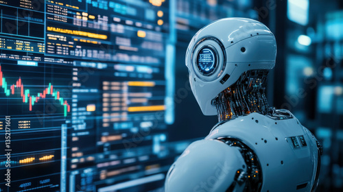 futuristic robotic figure analyzes stock market data on digital screen, showcasing advanced technology and AI capabilities. scene evokes sense of innovation and progress in trading