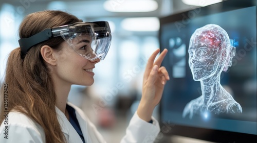 Futuristic Scientist conducting AI-powered Research with Virtual AI Avatar Assistance