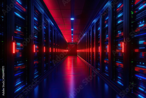 Futuristic server room technology showcase data center digital infrastructure high-tech environment wide-angle view innovation concept
