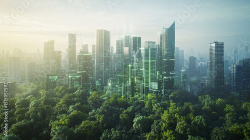 Futuristic smart city with high rise buildings surrounded by greenery, showcasing innovation