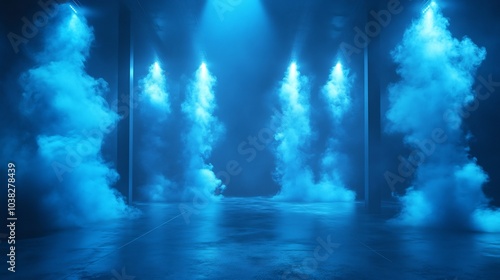 Futuristic stage bathed in vivid blue spotlights with clouds of smoke drifting through the air against a deep black void creating a sense of mystery and anticipation for an epic event