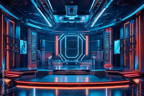 Futuristic stage, neon lights, vibrant blue and red.