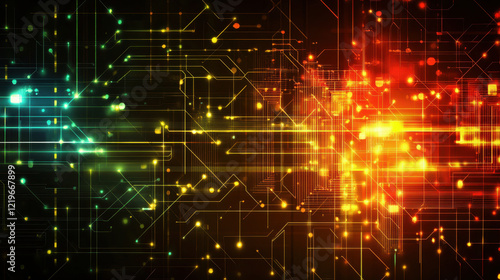 Futuristic technology background with circuit board patterns, digital data streams, glowing lines, abstract shapes, and high-tech elements in a vibrant color scheme
