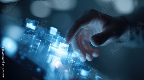 Futuristic Technology Interface: Human Finger Interacting with Holographic Display, Data Visualization and Augmented Reality