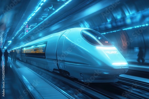 Futuristic train arriving at a high-tech station in a bustling city during the year 2099 with vibrant neon lights and advanced technology