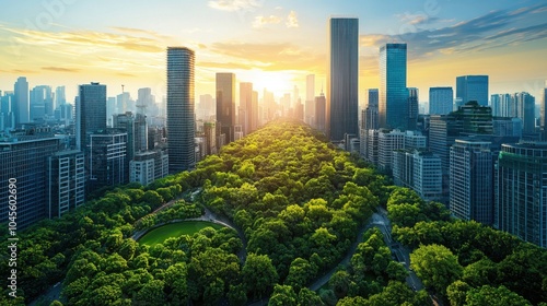 Futuristic urban landscape integrating nature and direct air capture technologies