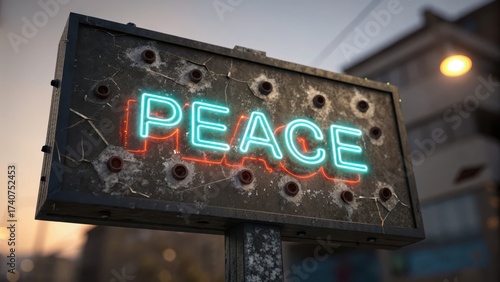 futuristic war cityscape A neon sign displaying the word "PEACE" with a worn, urban background.